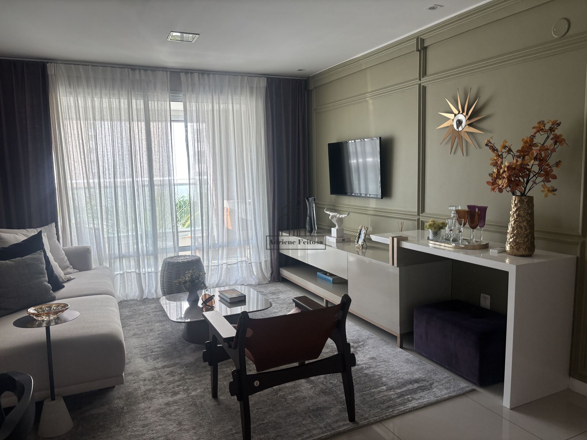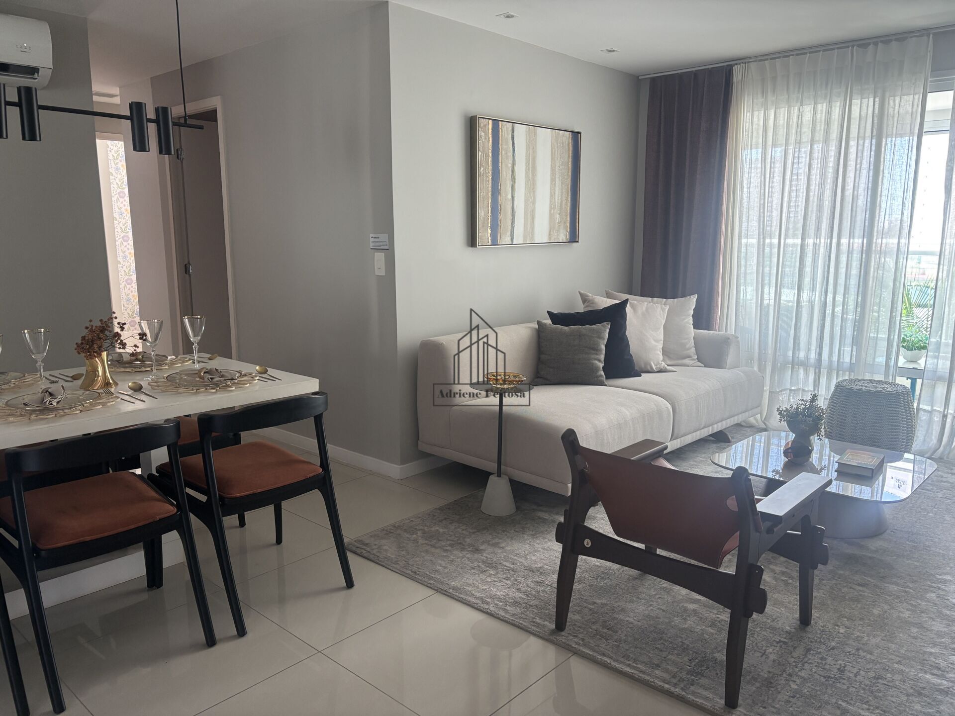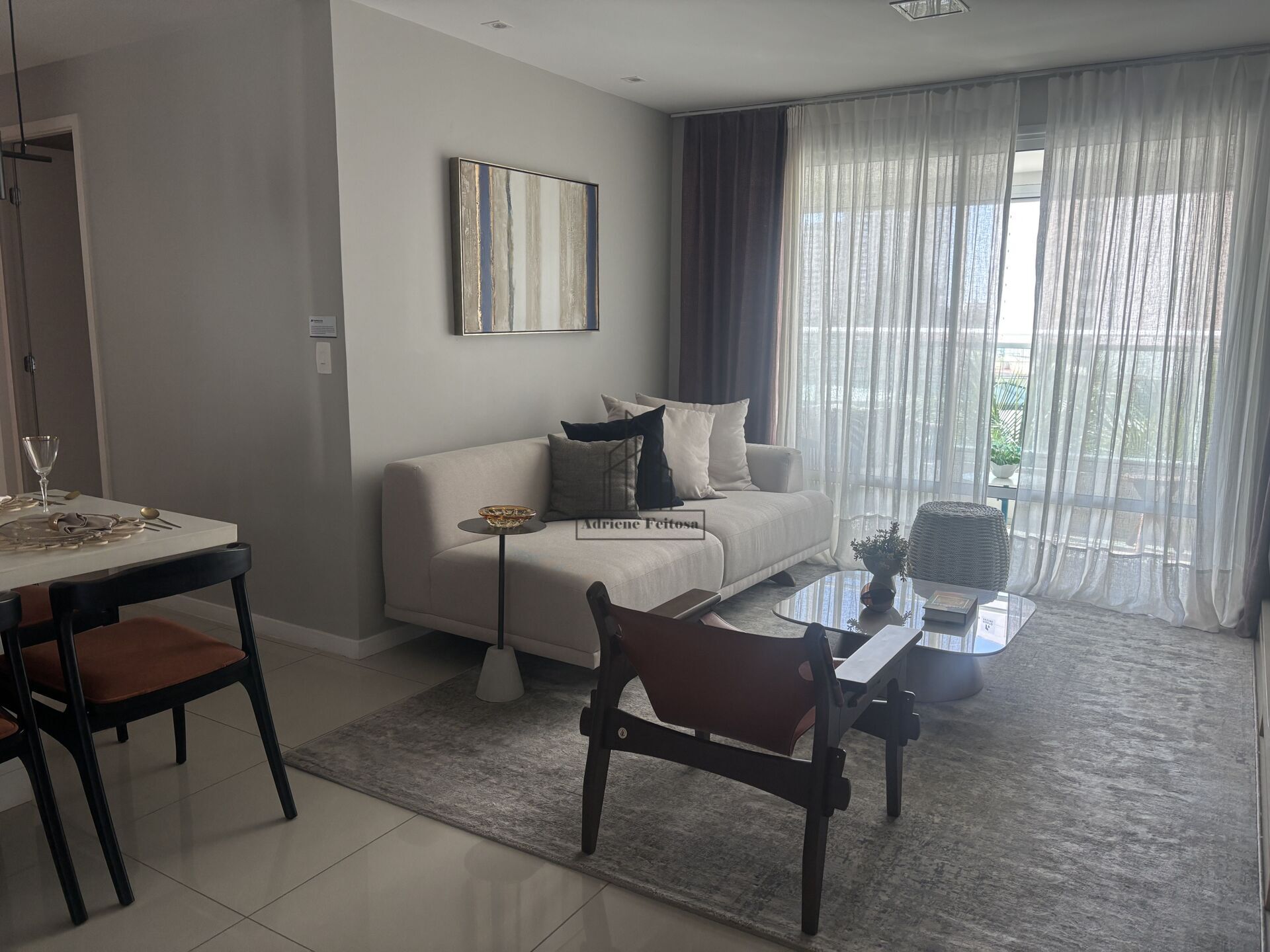 O apartamento tem 89 m2 e tem toda a mobília fixa e solta, além de cortina de vidro, ar condicionado, cooktop, máquina de lavar roupas e muito mais.